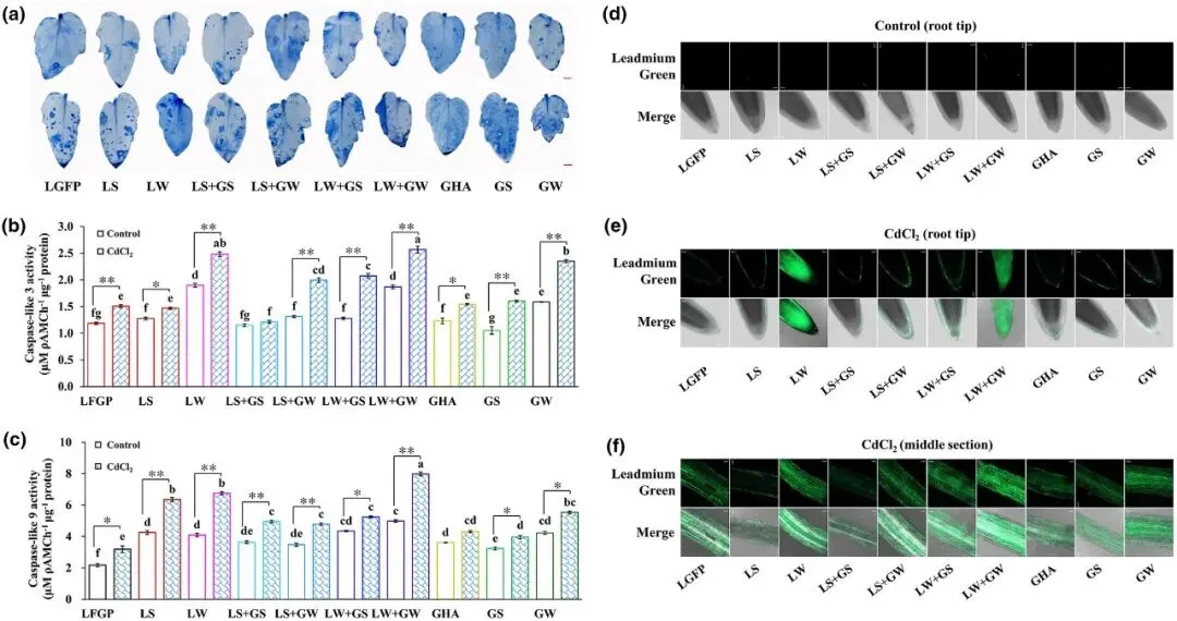 进一步对双突变杂交株系的分析表明,GSNOR 和 LCD 的 S-亚硝基化修饰在功能上具有叠加效应,共同导致更为严重的程序性细胞死亡(PCD)表型,并伴随着明显的细胞核形态异常。结合镉荧光探针分析发现,S-亚硝基化修饰突变体,尤其是双修饰模拟突变体(LW+GW),其根系中镉的积累显著增加。这一结果表明,S-亚硝基化修饰通过破坏 GSNOR–LCD 复合体的形成,削弱根系对镉的滞留或外排能力,从而进一步加剧 Cd 胁迫诱导的程序性细胞死亡(图 6)。