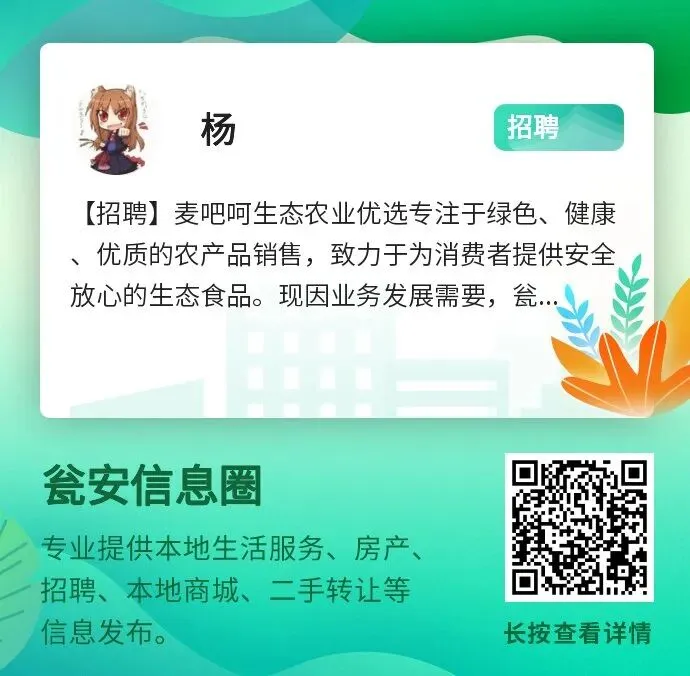 麦吧呵生态农业优选专注于绿色、健康、优质的农产品销售,致力于为消费者提供安全放心的生态食品。现因业务发展需要,瓮安县锦美时代广场店面向社会诚聘英才,欢迎热爱生活、乐于**、有志于生态农业推广的朋友加入我们!2. 主动接待顾客,耐心解答咨询,引导顾客体验并完成购买;2. 具备良好的沟通表达能力和服务意识,具有一定的吃苦耐劳精神;3. 性格开朗,对工作充满热情,有较强的学习能力和团队合作精神;4. 能适应零售行业工作节奏,服从门店管理及排班安排。2. 销售提成:按个人销售额百分比计算,多劳多得;我们期待对生态农业有热情、愿意踏实奋斗的你,与麦吧呵一起成长,共创健康生活!来源:网络整理