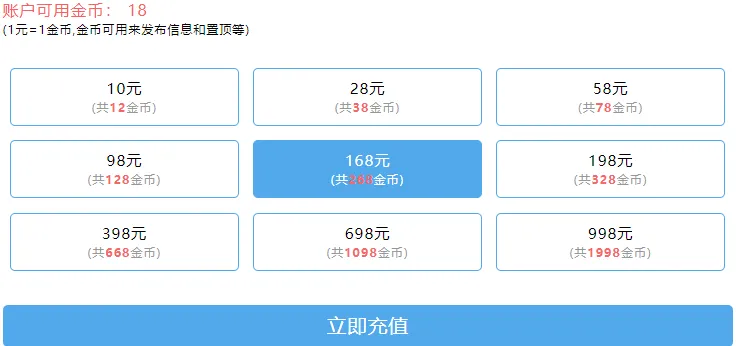 打广告,发布信息,谈合作,识别二维码加客服微信qianmeiyuan9526金币充值支付:先进行金币充值,推出有168元(共268金币)、398元(668金币)、998元(1998金币)等多种充值方式(2年内有效),1个金币相当于1元,金币置顶信息也是10个金币/天。