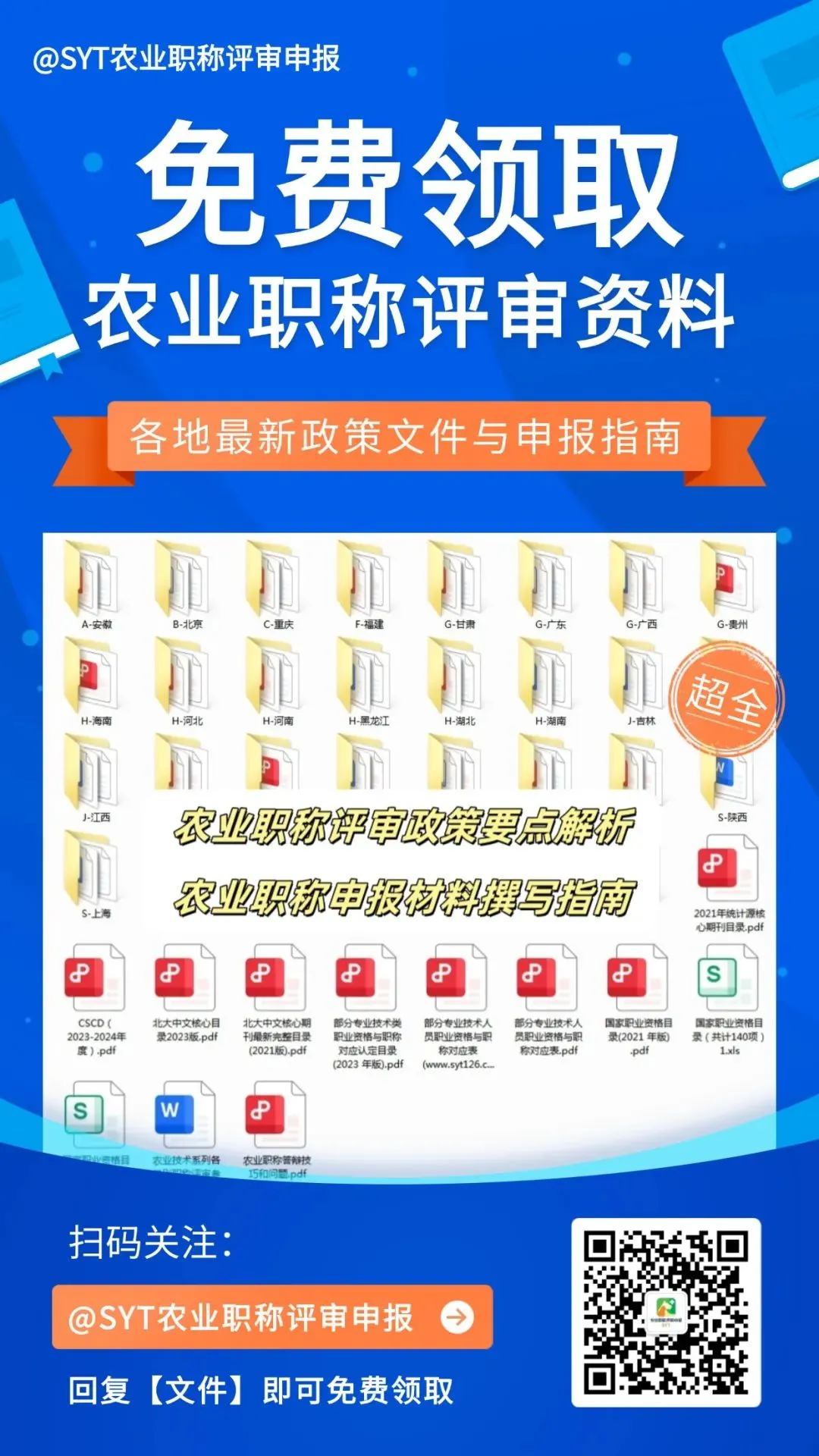 农业职称评审全套资料包括各地农业职称评审政策、申报指南、评审标准、考试大纲等等。无论您是初次申报还是准备晋升,这些资料都能帮助您清晰了解评审流程,把握重点难点,提高申报成功率。关注公众号,后台回复【文件】即可免费领取!