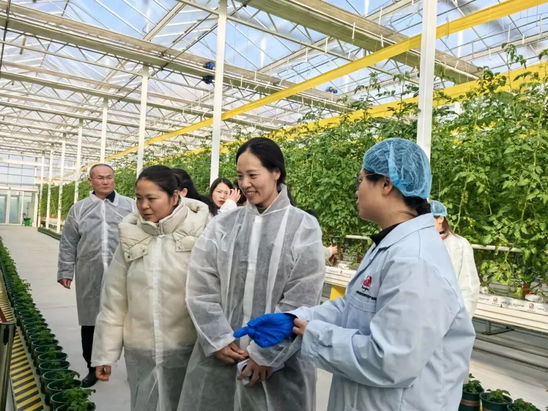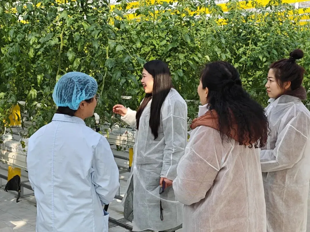 在生产技术员李梦瑶的带领下,参观团深入玻璃温室核心区域。这里融合了多项前沿种植技术:采用椰糠基质无土栽培技术,从源头杜绝土传病害;通过智能水肥一体化系统,实现精准供给与高效利用;创新引入熊蜂授粉技术,提升果实品质和产量。目前,温室内规模化种植40余个品种的高品质番茄,涵盖多种特色品类,兼顾口感与品质需求。依托专业选育技术,项目团队成功培育出综合抗病性更强、产量更稳定、品质更优良的功能型口感番茄,这类番茄不仅风味浓郁、口感出众,更具备药食同源的独特价值,打破传统番茄的品类局限,实现营养价值与食用体验的双重升级。