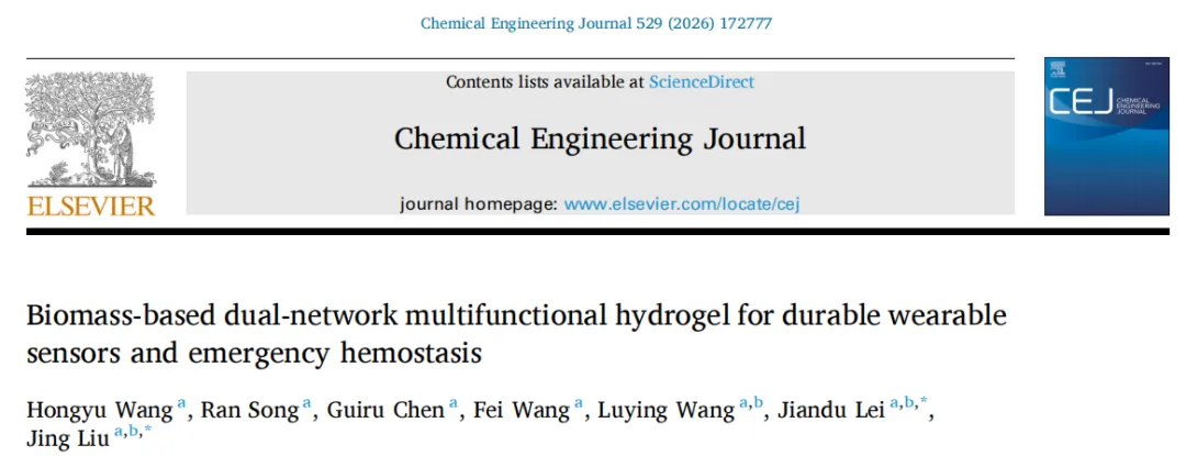 Hongyu Wang, Ran Song, Guiru Chen, el at. Biomass-based dual-network multifunctional hydrogel for durable wearable sensors and emergency hemostasis, Chemical Engineering Journal. 2026, 529, 172777.