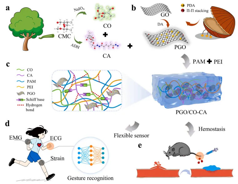 同时,应急止血是创伤救治的关键环节,需要材料兼具强组织粘附、快速成膜和生物安全性,但现有止血材料与柔性传感功能的集成化研究极为匮乏。羧甲基纤维素(CMC)作为储量丰富的生物质材料,具有良好的生物相容性和化学可调性,但过量羟基导致吸水性过强,影响粘附性和稳定性。如何通过结构设计,将生物质材料转化为兼具高力学性能、强粘附、高导电和止血功能的多功能水凝胶,成为亟待解决的核心问题。