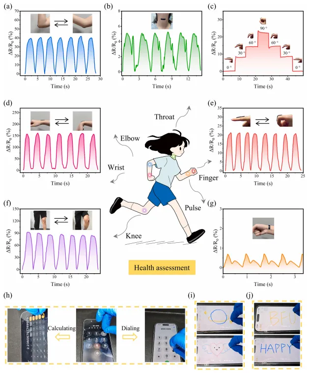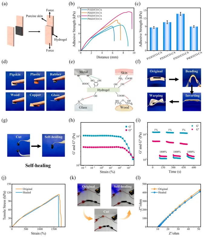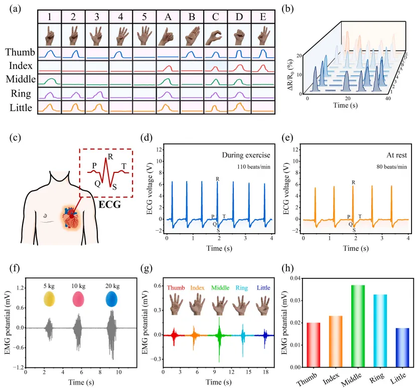 北京林业大学雷建都、刘静团队研发的水凝胶,通过结合基动态交联网络与聚丙烯酰胺(PAM)网络,并引入聚多巴胺改性石墨烯纳米片(PGO)及支化聚乙烯亚胺(PEI),实现了强组织粘附性(13.7 kPa)、高导电性(0.46 S/m)与传感灵敏度(GF=2.26),具备可调模量(应力113.5 kPa,应变1672%),能够紧密贴合皮肤,应用于运动信号监测、摩尔斯电码传输以及心电图、肌电图等生理信号检测,结合机器学习实现手势识别准确率达98%。该水凝胶还可于伤口表面形成坚固物理屏障,实现快速止血,在柔性传感与应急止血领域展现出广阔应用前景。