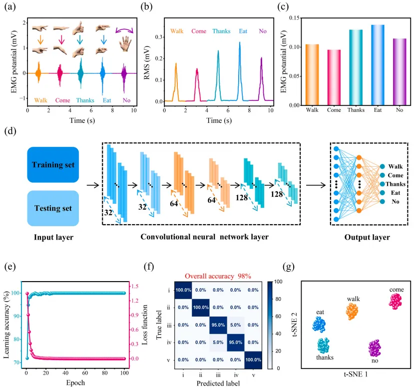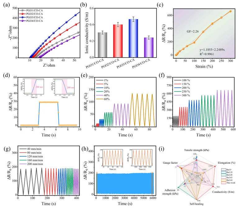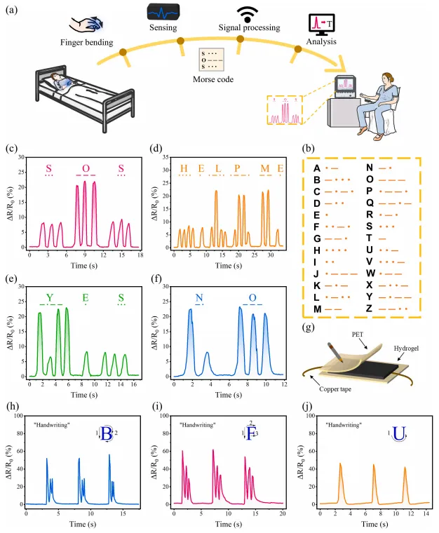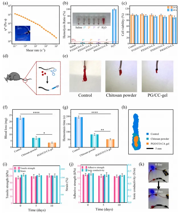 图 3. 水凝胶的力学性能图 8. 水凝胶在摩尔斯电码传输与签名识别中的应用图 9. 水凝胶在手势识别与心电、肌电信号检测中的应用本研究成功研发出一种生物质基双网络多功能水凝胶(PGO/CO-CA),通过贻贝启发的 PGO 纳米片改性、CMC 基动态席夫碱网络与 PAM 刚性网络的协同作用,以及 PEI 的引入,实现了力学性能、粘附性、导电性、生物相容性和止血功能的完美集成。该水凝胶不仅能精准监测人体运动信号、生理电信号,还能通过机器学习实现手势识别,为可穿戴健康监测提供了高性能平台;同时其快速止血和生物相容性优势,满足了应急创伤救治的需求。
