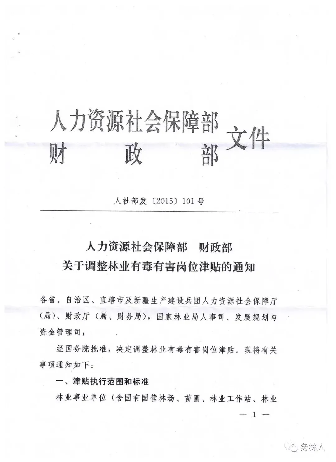 >人力资源和社会保障部、财政部关于调整林业有毒有害岗位津贴通知
