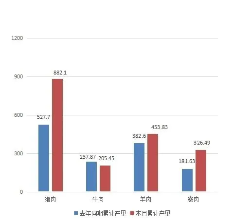 截至1月底,我市牲畜总头数为18.1万头只,同比下降3.73%。其中,大小畜存栏15.8万头(牛等大牲畜存栏1.21万头、羊存栏为14.59万只),同比下降0.71%;生猪存栏为2.3万头,同比下降20.36%,能繁母猪存栏量为982头。禽存栏81.06万羽,同比下降5.21%。肉类总产量为1867.87吨,同比增长40.06%;其中猪肉产量882.1吨,同比增长67.16%;牛肉产量205.45吨,同比下降13.63%;羊肉产量453.83吨,同比增长18.62%;禽肉产量326.49吨,同比增长79.76%。禽蛋总产量993.74吨,同比下降7.71%。