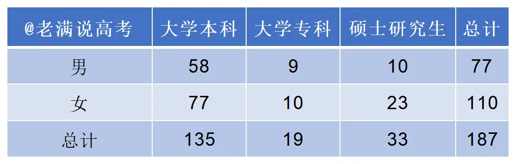 先来看看整体的学历分布情况。这187个岗位中,大学本科毕业生占了135人,接近总人数的73%;大学专科19人,占比约10%;硕士研究生33人,占比约18%。