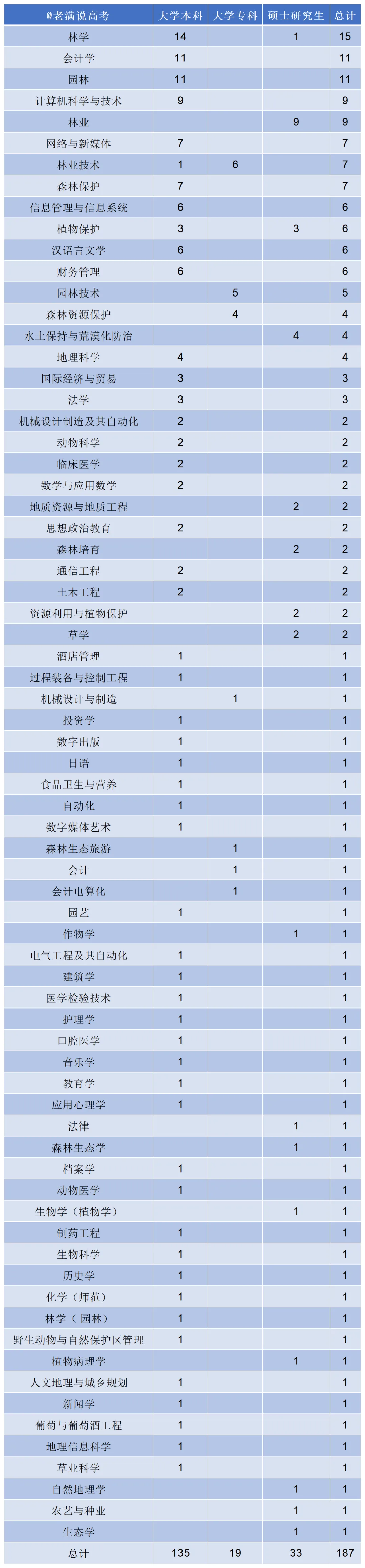你发现没有,林学类和园林类相关专业加起来,妥妥地占据了半壁江山。林学本科14人、硕士1人,园林11人,林业技术7人,森林保护7人,园林技术专科5人,森林资源保护专科4人,还有草业科学、草学、森林培育、森林生态学等等。加一块儿,将近七十个岗位跟林业、草原、生态相关。