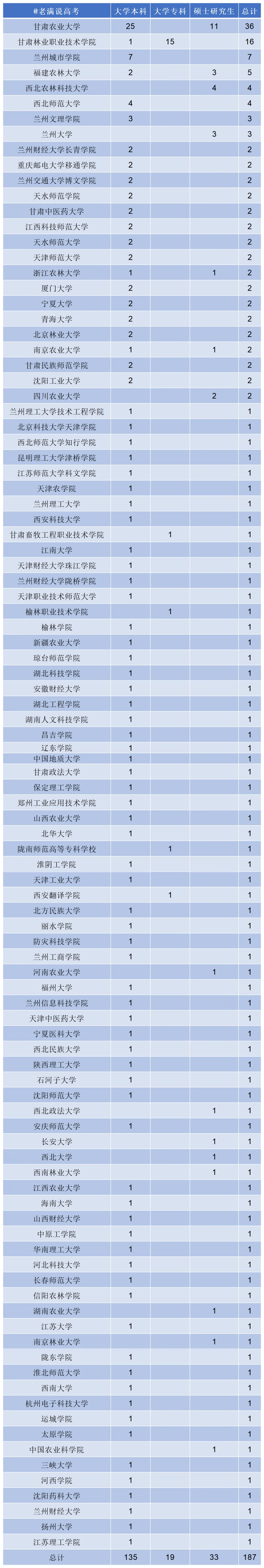 再来看看外省学校的录用情况。福建农林大学5人、西北农林科技大学4人、西北师范大学4人、兰州大学3人、四川农业大学2人、浙江农林大学2人、北京林业大学2人、南京农业大学2人……这些学校都是农林领域的知名院校。