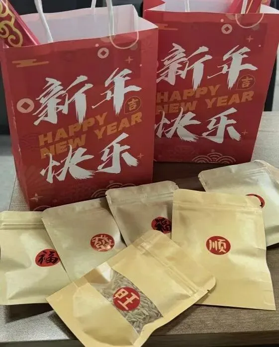 随后,冯书记与老师们一同为同学们送上独具学院特色的“新春福袋”。福袋里装有学院师生做实验用的水稻和豌豆种子,以及一个学院定制款“福”字和一袋坚果,寓意播种希望,硕果累累。师生们共同合影留念,并录制了新春祝福视频。镜头定格了现场的温馨与笑语,也传递出大家对新年真挚而美好的期盼。