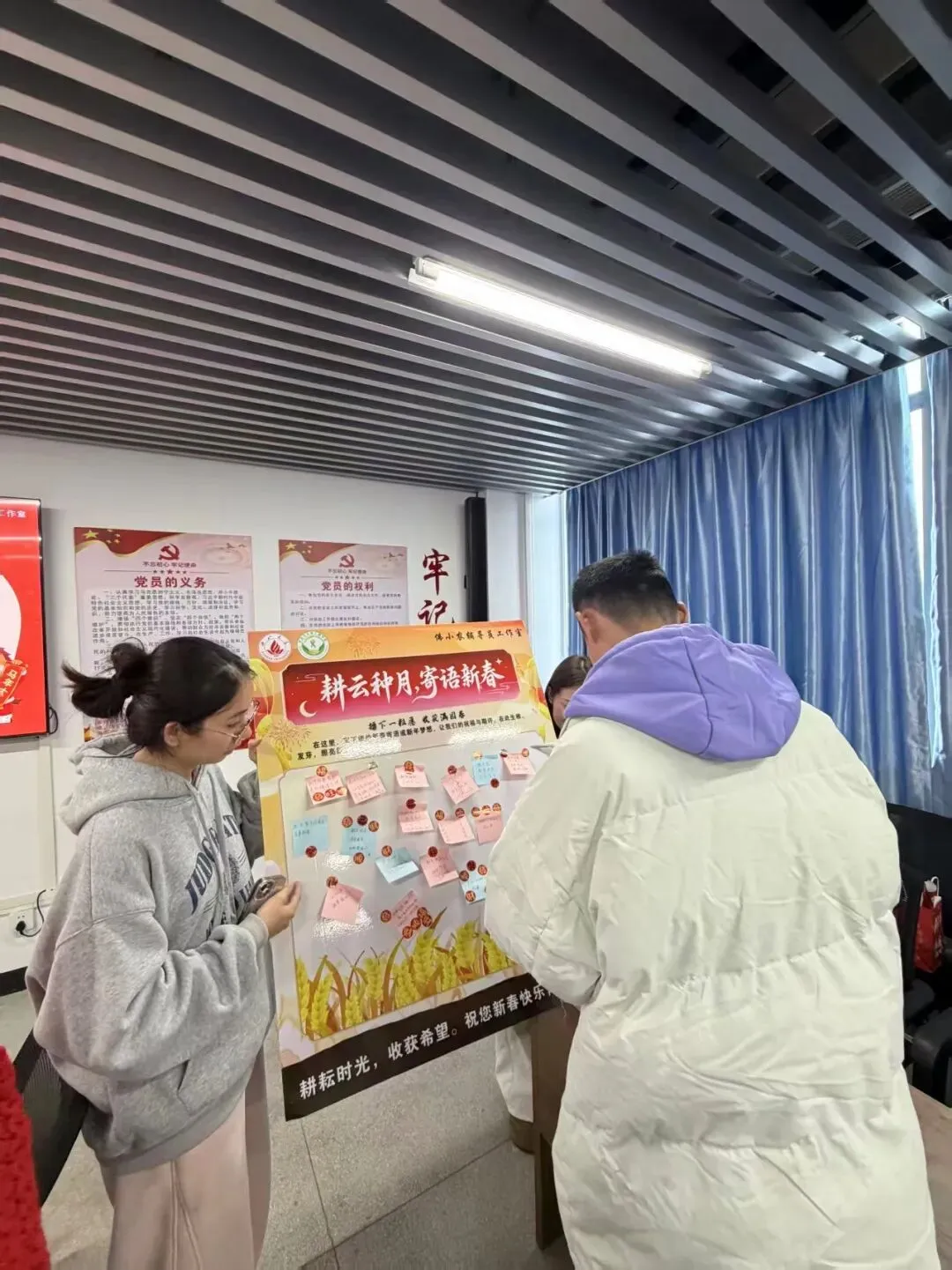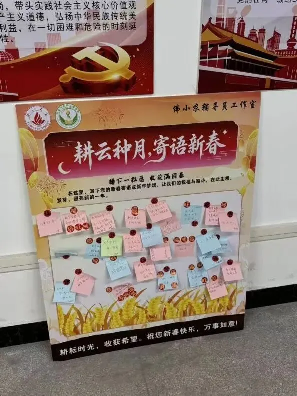 活动还设置了“写新春祝福”环节,师生们纷纷在彩笺上留下真挚祝愿,并亲手将一张张祝福贴满新春展板。笔墨间情意流转,展板上暖意融融,汇聚成对新年的深切期许。