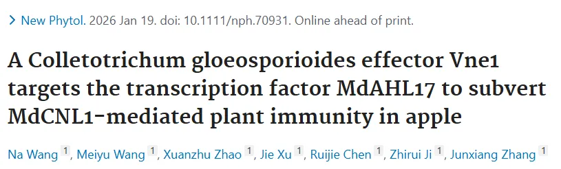 2026年1月19日,中国农业科学院果树研究所张俊祥课题组在国际植物科学权威期刊《New Phytologist》在线发表题为“A Colletotrichum gloeosporioides effector Vne1 targets the transcription factor MdAHL17 to subvert MdCNL1-mediated plant immunity in apple”的研究论文,首次系统揭示了胶孢炭疽菌抑制苹果免疫反应的新机制。该研究为苹果炭疽叶枯病的抗病育种提供了关键理论依据与潜在技术靶点。