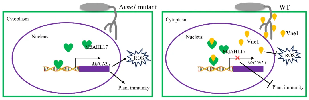 本研究发现,Vne1通过抑制MdAHL17的DNA结合能力,阻断了其对MdCNL1的转录激活,从而有效瓦解苹果的免疫防御体系,促进病菌成功侵染。该研究首次从“转录因子—抗病基因”调控轴的角度,揭示了病原菌效应蛋白干扰NBS-LRR介导免疫的新途径,为深入理解植物—病原互作提供了新视角。