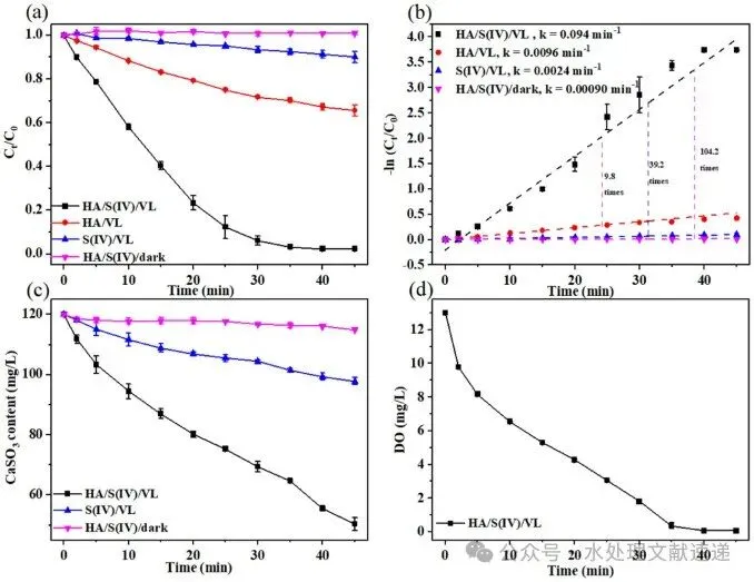 Fig. 1. The variation in ROX degradation percentage across different systems (a) and the corresponding pseudo-second-order kinetic fittings (b); the consumption kinetics of S(IV) across different systems (c); and the variation of dissolved oxygen in the S(IV)/HA/VL system (d). Experimental conditions: [S(IV)] = 1 mM, HA = 5 mg C/L, [ROX] = 5 mg/L, [initial pH] = 6.0 ± 0.05, T = 25 °C.