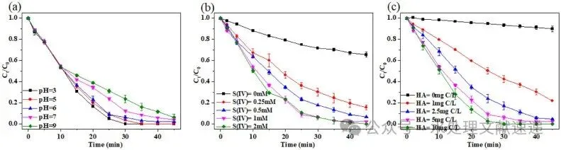 Fig. 2. Effects of operating parameters on ROX degradation in S(IV)/HA/VL system. (a) initial pH; (b) S(IV) concentration; (c) HA concentration. Experimental conditions: [ROX] = 5 mg/L, [HA] = 1 – 10 mg C/L, [S(IV)] = 0.25 – 2 mM, [initial pH] = 3.0 – 9.0, T = 25 °C.