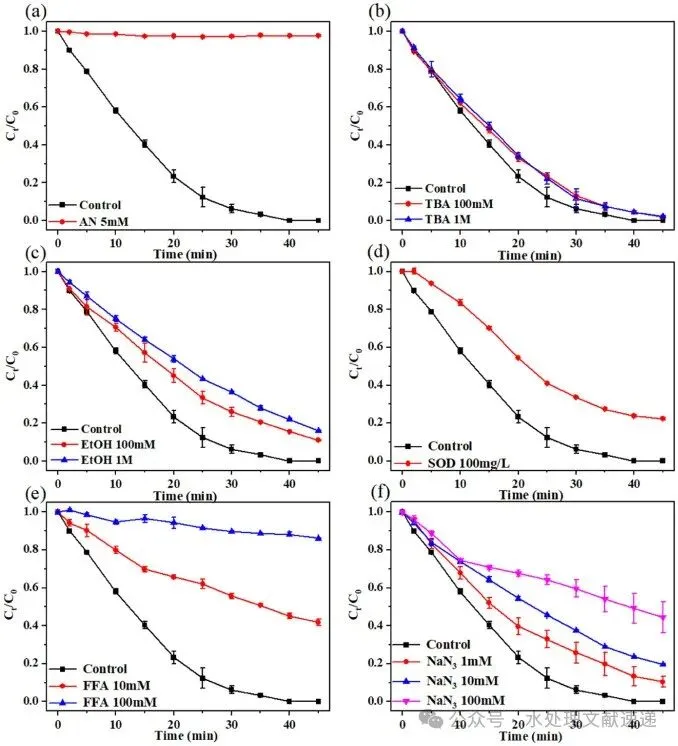 Fig. 3. Effect of AN(a), TBA (b), EtOH (c), SOD (d), FFA (e) and NaN3 (f) on ROX degradation in the S(IV)/HA/VL system. Experimental conditions: [ROX] = 5 mg/L, [S(IV)] = 1 mM, [HA] = 5 mg C/L, [initial pH] = 6.0 ± 0.05, T = 25 °C.