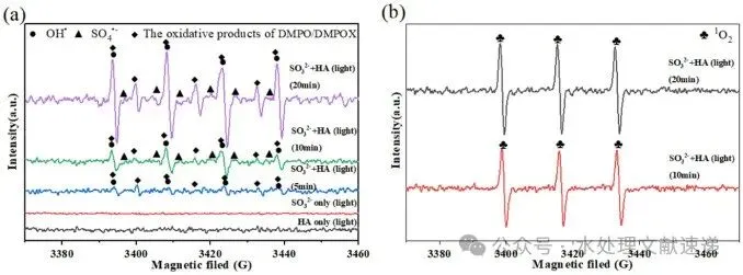 Fig. 4. DMPO (a) and TEMP (b) spin-trapping EPR spectra of HA /S(IV) /VL system. Experimental conditions: [S(IV)] = 1 mM, [HA] = 5 mg C/L, [initial pH] = 6.0 ± 0.05, T = 25 °C.