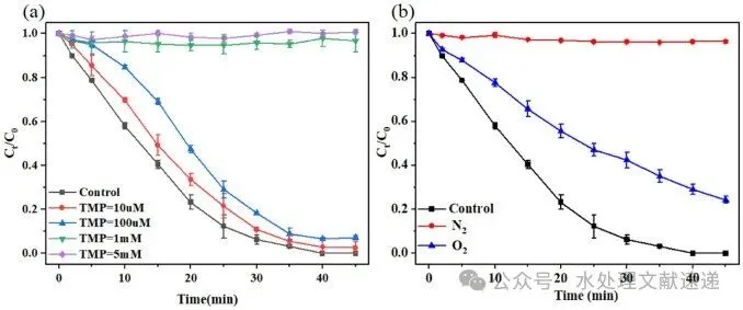 Fig. 5. Effect of different atmospheric conditions (a) and TMP (b) on the oxidation of ROX. Experimental conditions: [ROX] = 5 mg/L, [S(IV)] = 1 mM, [HA] = 5 mg C/L, [initial pH] = 6.0 ± 0.05, T = 25 °C.
