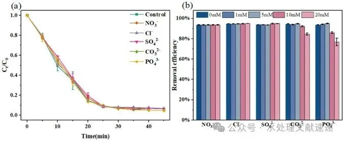 Fig. 6. Effects of inorganic ions on ROX degradation (a) and the removal rate of ROX (b). Experimental conditions:(a) [ROX] = 5 mg/L, [S(IV)] = 1 mM, [HA] = 5 mg C/L, [initial pH] = 6.0 ± 0.05, inorganic ions = 5 mmol L−1, T = 25 °C;(b) [ROX] = 5 mg/L, [S(IV)] = 1 mM, [HA] = 5 mg C/L, [initial pH] = 6.0 ± 0.05, inorganic ions = 0 - 20 mmol L−1, T = 25 °C.
