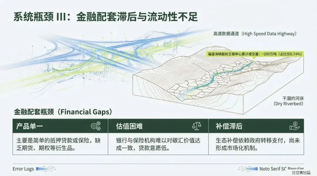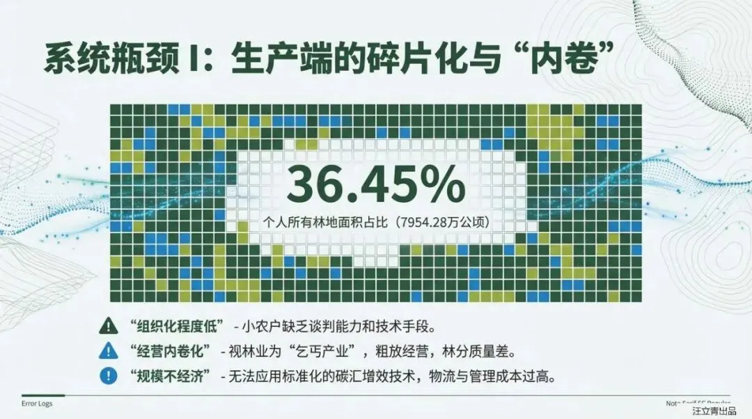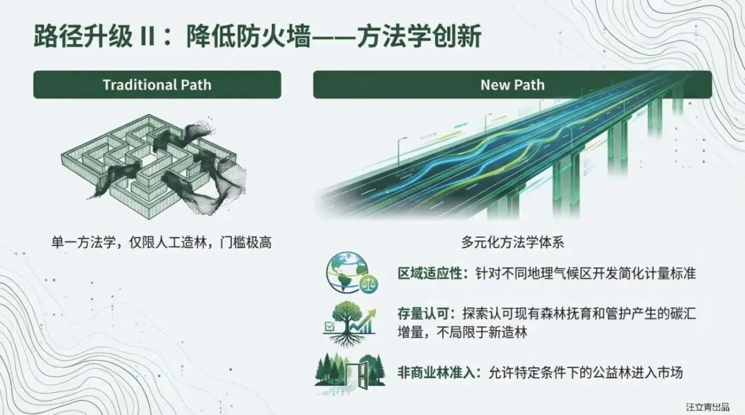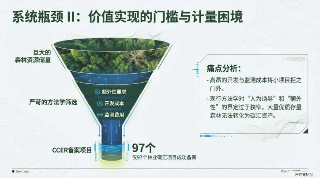 然而,掘金之路并非坦途。报告犀利剖析了当前市场的“隐形壁垒”:交易成本高企,信息不对称让买卖双方疲于博弈;产权界定模糊,缺乏明确的收益权让经营者望而却步,且容易陷入“搭便车”的公地悲剧;变现渠道不畅,现有的CCER项目开发门槛过高、金融产品单一,导致大量优质资源仍处于“沉睡”状态。这些痛点正在阻碍林业碳汇从“政策红利”向“市场红利”的转化。