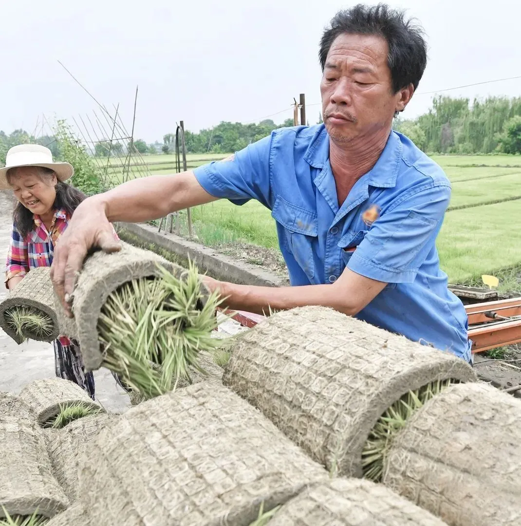 ⏫ 杨万顺和工人们将育好的秧苗卷起装车转运至田间