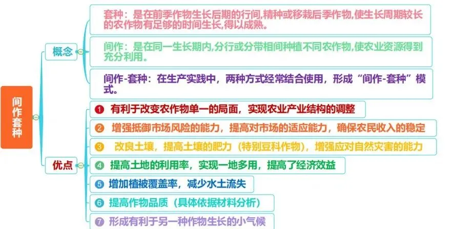 套种作物的共同生长的时间短。也就是说指在前季作物生长后期栽种后季作物,即甲还没收就把乙种下,可延长光合作用时间。套种是我国农民的传统经验,是农业上的一项增产措施。一般把几种作物同时期播种的叫间作,不同时期播种的叫套种。集约利用时间的种植方式。对比单作它不仅能阶段性地充分利用空间,更重要的是能延长后季作物的生长季节,两季作物,共同生长的时间短,一般不超过套种作物全生育期的一半。套种能提高复种指数,提高年总产量。套种侧重在时间上集约利用光热水资源,是一种集约利用时间的种植方式。间作、套种在农业生产中的作用:提高产量和经济效益;提高产量稳定性;增加产品多样性;增强对病虫害的抗性;保护资源环境;缓解作物争地的矛盾。1.(2019厦门一检)马铃薯性喜冷凉,其地下薯块形成和生长需要疏松透气、凉爽湿润的土壤环境。块茎生长的适温是16-18°C,当地温高于25°C时,块茎停止生长。