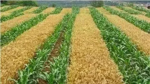 间种往往是高棵作物与矮棵作物间种,如玉米间种大豆或蔬菜。同时,两种作物间作还可产生互补作用,如宽窄行间作或带状间作中的高杆作物有一定的边行优势、豆科与禾本科间作有利于补充土壤氮元素的消耗等。实行间种对高作物可以密植,充分利用边际效应获得高产,矮作物受影响较小,就总体来说由于通风透光好,可充分利用光能和CO2,能提高20%左右的产量。其中高作物行数越少,矮作物的行数越多,间种效果越好。一般多采用2行高作物间4行矮作物叫2:4 采用4:6或4:4也较多 。间种比例可根据具体条件来定。 但间作时不同作物之间也常存在着对阳光、水分、养分等的激烈竞争。因此对株型高矮不一、生育期长短稍有参差的作物进行合理搭配和在田间配置宽窄不等的种植行距,有助于提高间作效果。当前的趋势是旱地、低产地、用人畜力耕作的田地及豆科、禾本科作物应用间作较多。套种:在前季作物生长后期的株行间种植(播种或移摘)后季作物的种植方式。在前季作物生长后期的株、行或畦间播种或栽植后季作物。如图