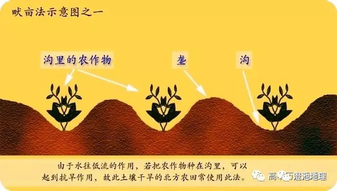 【解析】第1题读图可知,图1甲畎亩法的特点是:在地势高的田里,将作物种在沟里,而不种在垄上,这种畎亩法叫做“上田弃亩”,由于水往低处流,把农作物种在沟里,有利于对农作物抗旱保墒。第2题读图可知,甲为畎亩法的“上田弃亩”,主要是在地势高的田里,将农作物中在沟里,而不种在垄上,即高田种沟不种垄,有利于抗旱保墒;乙为畎亩法的“下田弃畎”,主要是在地势低的田里,将农作物种在垄上,而不种在沟内,即低田种垄不种沟,有利于农作物生长过程中充分的通风透光。第3题读图可知,畎亩法是在我国北方地区最早出现的一种以蓄水保墒为中心的抗旱耕作方法。图甲是高田种沟不种垄,有利于抗旱保墒;图乙是低田种垄不种沟,有利于排水防涝,因此,水分是影响图示该地区发展这种农业耕作方法的主导因素。