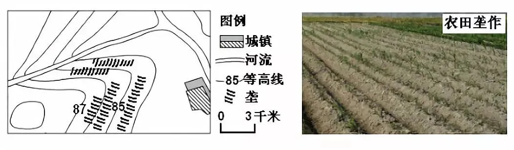 例2:图中,左图为华北某乡镇驻地附近的等高线地形图,右图为农田垄作景观图。读图,回答4~6题。