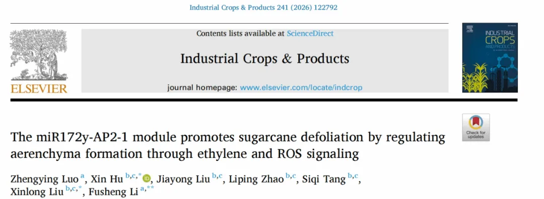 近日,云南农业大学农学与生物技术学院云南省作物生产与智慧农业重点实验室李富生教授团队,携手云南省农业科学院甘蔗研究所热带生物作物育种全国重点实验室刘新龙研究员团队,在农林科学领域国际权威期刊《Industrial Crops & Products》(中科院一区,影响因子6.2)在线发表了一项重要研究成果。该研究题为“The miR172y-AP2-1 module promotes sugarcane defoliation by regulating aerenchyma formation through ethylene and ROS signaling”,首次系统揭示了甘蔗叶片自然脱落的分子调控机制。