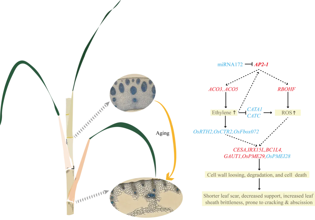 在此基础上,团队进一步构建了调控这一过程的关键分子网络,并鉴定出一个核心调控模块miR172y-AP2-1。该模块表现出明确的时空表达特异性:miR172y通过直接靶向并抑制转录因子AP2-1的mRNA,调控通气组织的形成。在转基因水稻中过表达AP2-1后,叶鞘通气组织显著增强,叶片更易人工剥离;这一表型也在甘蔗中成功重现,验证了该模块在调控脱叶性状中的关键作用。