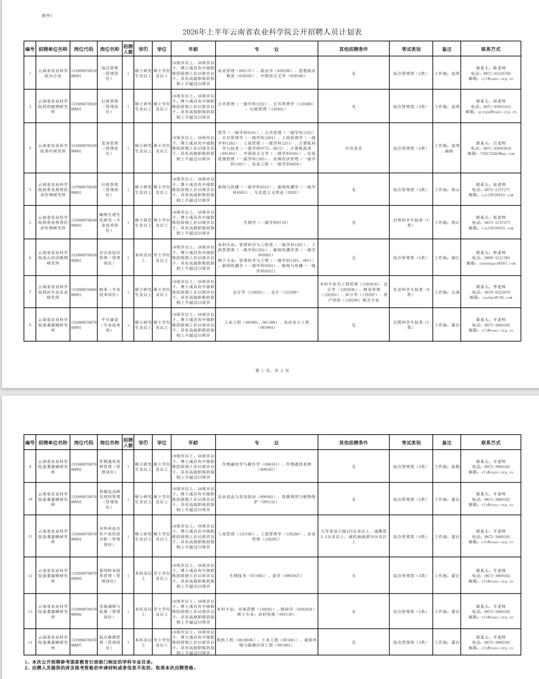 以上7家单位共公开招聘工作人员14名。具体招聘岗位及招聘条件,详见附件1.2026年上半年云南省农业科学院公开招聘人员计划表.xls