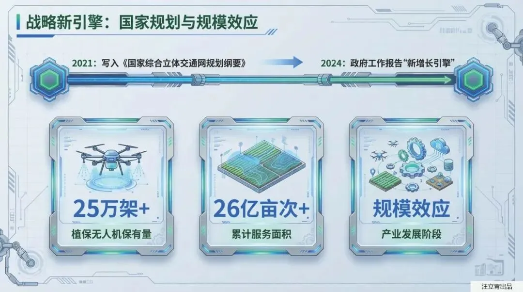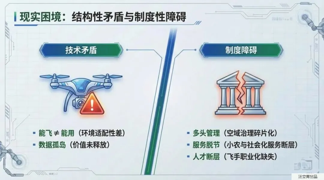 当“低空经济”首次被写入政府工作报告并确立为新增长引擎时,我们看到的不仅仅是头顶呼啸而过的无人机,而是一场关乎14亿人饭碗的农业现代化革命。数据显示,我国植保无人机保有量已突破25万架,服务面积超26亿亩次,似乎规模效应已成雏形。但透过繁荣的表象,一个尴尬的“结构性困境”正在浮现:面对我国复杂破碎的地形和老龄化的农村,先进的无人机正陷入“能飞不能用、能用难扩散”的泥潭。平原大田里飞得欢,但一进丘陵山区、果园茶园就“水土不服”;硬件卖得火热,但数据却成了“信息孤岛”,不仅互不兼容,更无法转化为指导生产的决策资产。这不仅仅是技术的博弈,更是一场关于资源、制度与生态的深层重构。我们正站在从“经验农业”向“数据驱动农业”惊险一跃的悬崖边,低空经济不再是简单的替代人力,而是通过高频监测、精准变量作业,实现对农业全链条的“降维打击”与重塑。