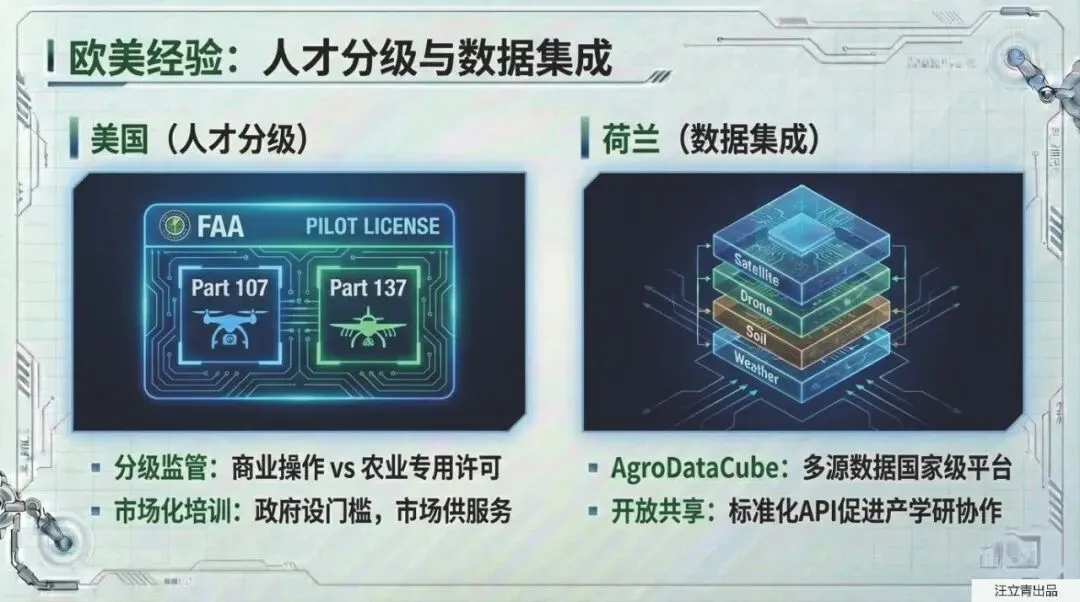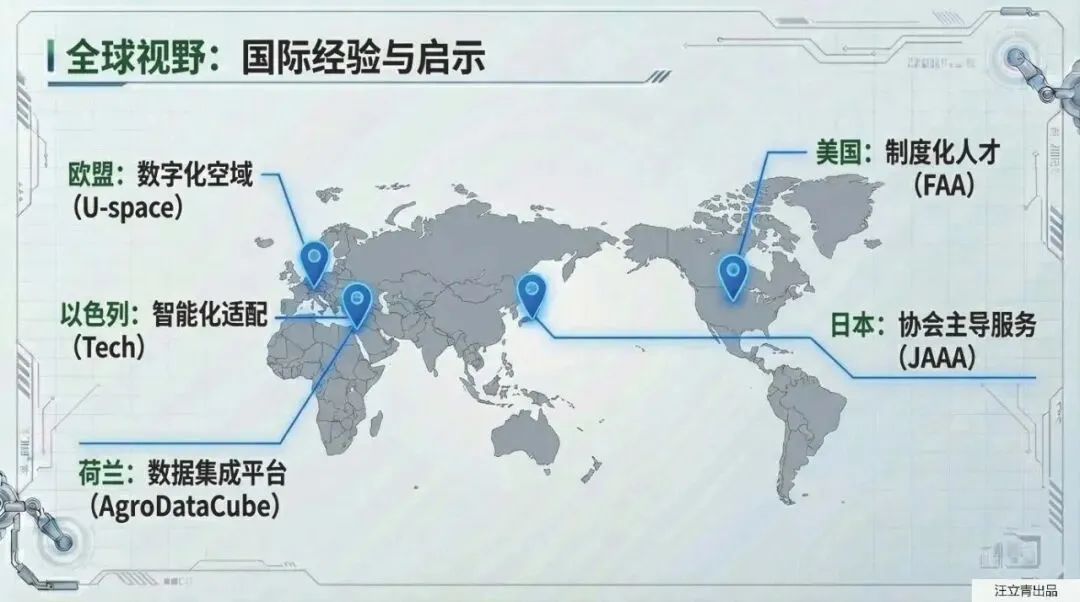 要想在这场万亿级的农业空域争夺战中破局,我们必须睁眼看世界,破解他山之石背后的“顶级心法”。研究深入剖析了全球五大农业强国的“低空杀手锏”:面对空域管理的碎片化,**欧盟**推出了“U-space”体系,用数字化平台替代人工审批,实现了空域资源的弹性调度与毫秒级响应;在极度干旱与复杂的地理条件下,**以色列**依靠“AI算法+模块化设计”,让无人机拥有了识别每一棵果树需求的“大脑”,实现了极限环境下的精准适配;面对严峻的老龄化,**日本**构建了以“行业协会主导+全员保险”的社会化服务体系,用制度信任填补了市场空白;**美国**则通过“严进宽出”的分级监管与市场化培训,解决了飞手短缺的难题;而**荷兰**更是打造了国家级“AgroDataCube”平台,将卫星、无人机与传感器数据熔于一炉,让数据真正变成了农业生产的新黄金。这些经验告诉我们,真正的低空霸权,不在于飞机飞得多高,而在于能否构建起一套技术与制度完美耦合的生态系统。