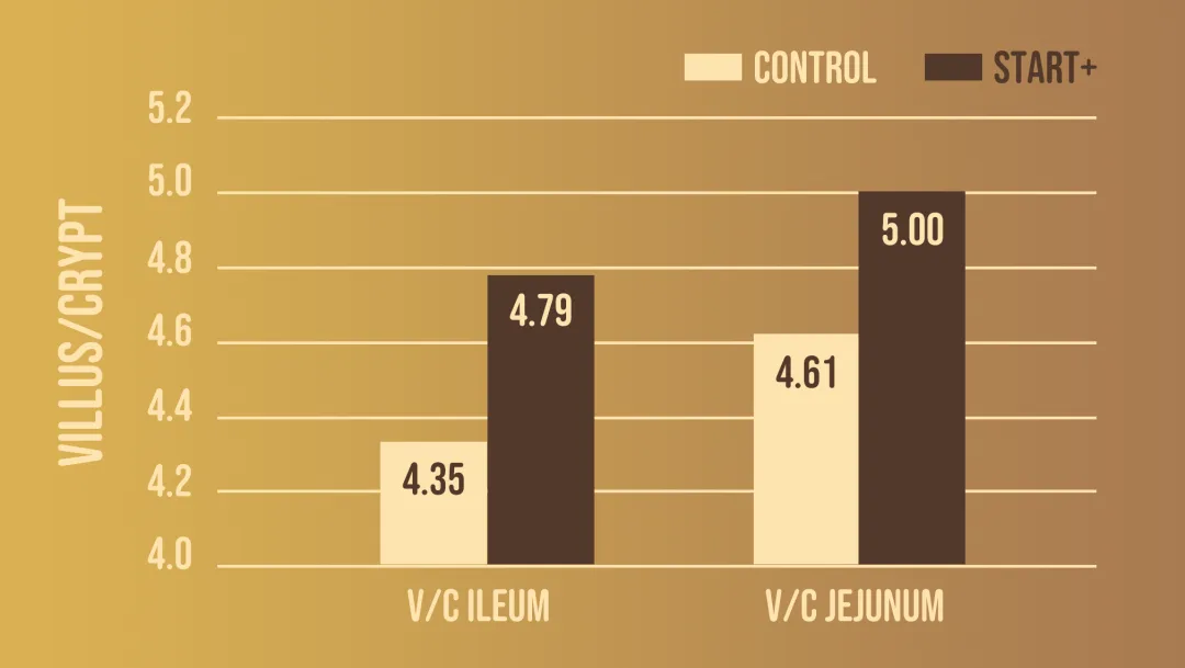 图注: 断奶时仔猪空肠与回肠的绒隐比(绒毛高度/隐窝深度),对比采食含/不含 START+ 的教槽料试验结果。
