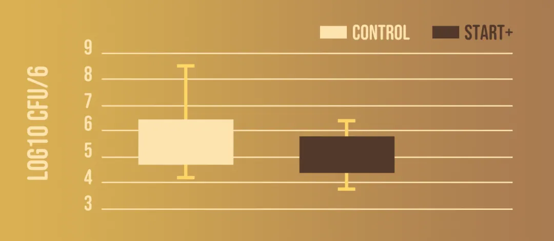 图注:断奶后第14天仔猪小肠黏膜上皮的大肠杆菌定植情况。试验组仔猪从断奶至断奶后第14日持续饲喂含START+日粮,对照组饲喂基础日粮。