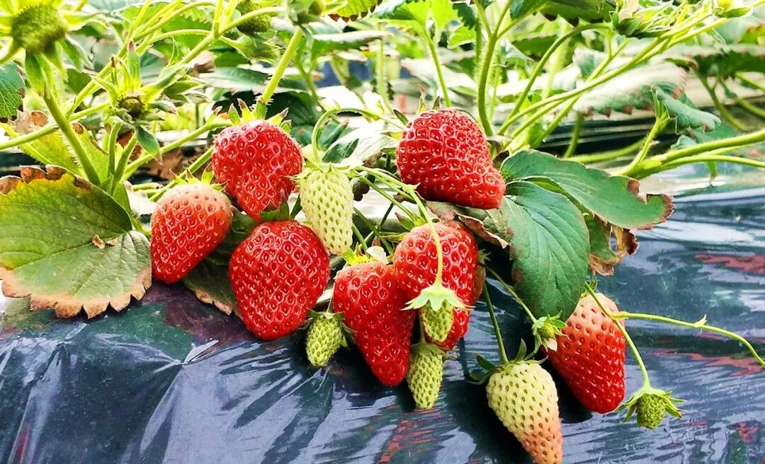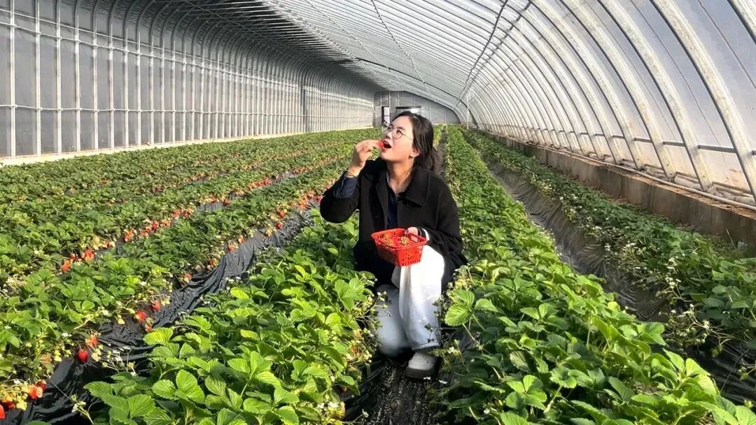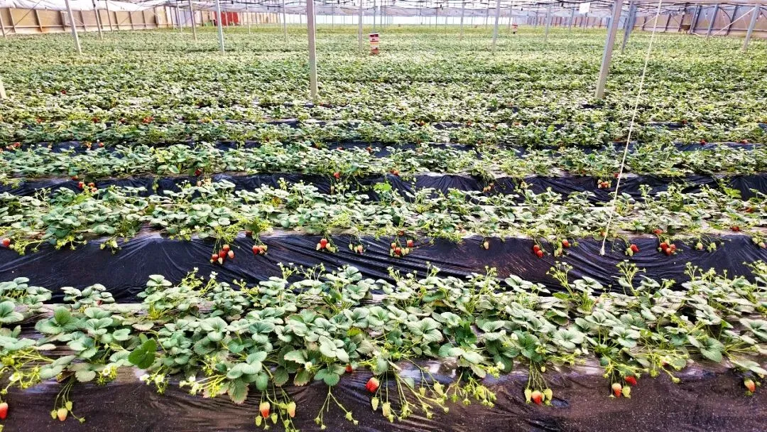 与蓝莓的“蓄势待发”相呼应,产业园内的草莓种植大棚早已是“红果累累”,进入了大规模成熟采收期。棚内温暖湿润,一排排整齐的草莓垄上,绿叶间点缀着无数鲜红欲滴的草莓果实,个头匀称,香气扑鼻。大棚内,游客提着采摘篮穿梭其间,欢声笑语不断,构成了一幅农旅融合的生动图景。这种“田间采摘+即时品尝”的模式,让草莓从“农产品”变身“体验品”,既延长了价值链,也让种植户的“经济账”变成了有温度的“人气账”。