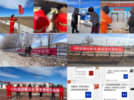 线下组织护林员走村入户,在嘎查村主要路口、村部等人员密集区域张贴《巴林右旗人民政府森林草原禁火令》180余份,面对面向农牧民及返乡人员答疑解惑,同步在重点区域悬挂防火旗60面、防火宣传横幅22条,营造“人人讲防火、时时讲防火、处处讲防火”的浓厚氛围。