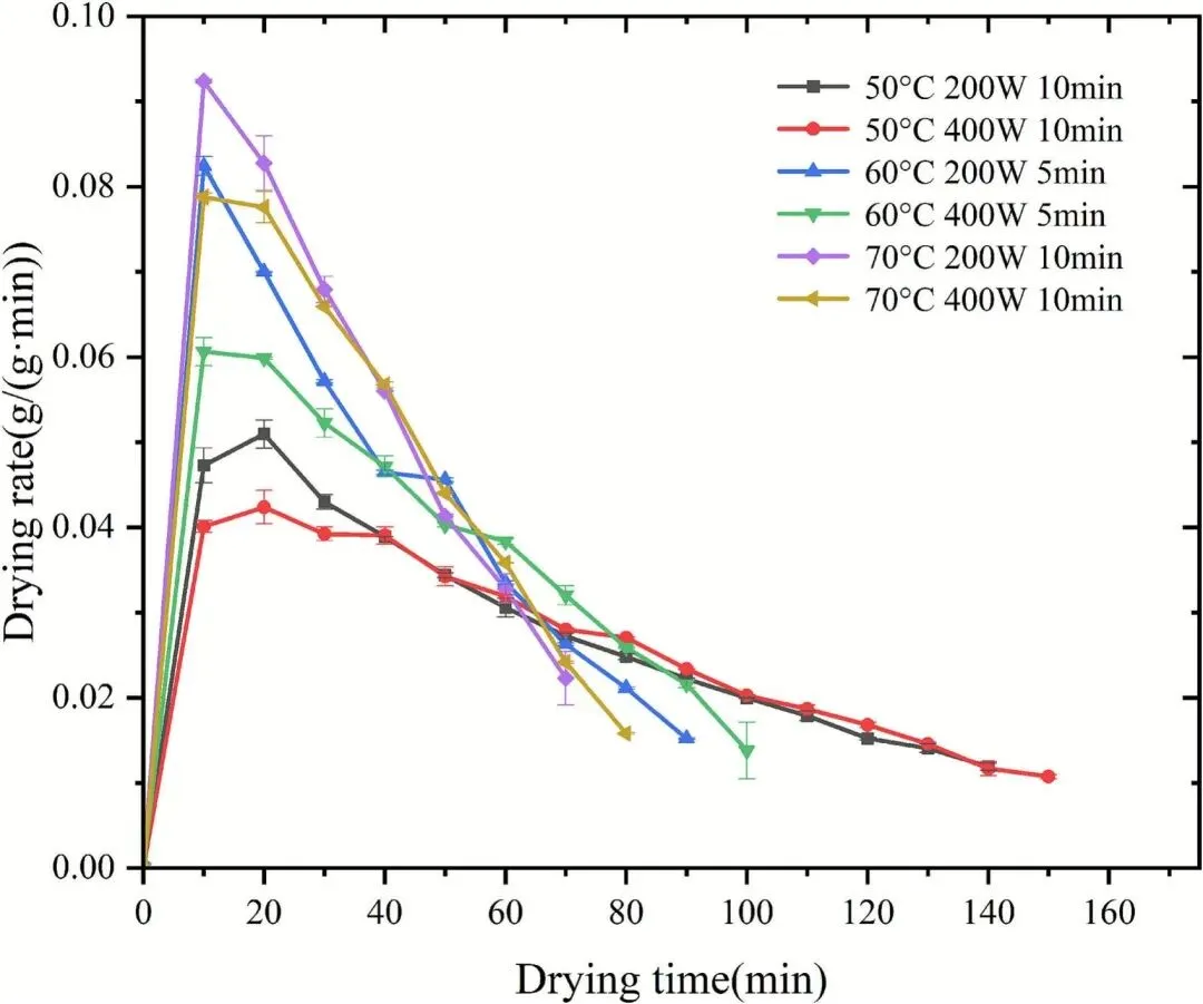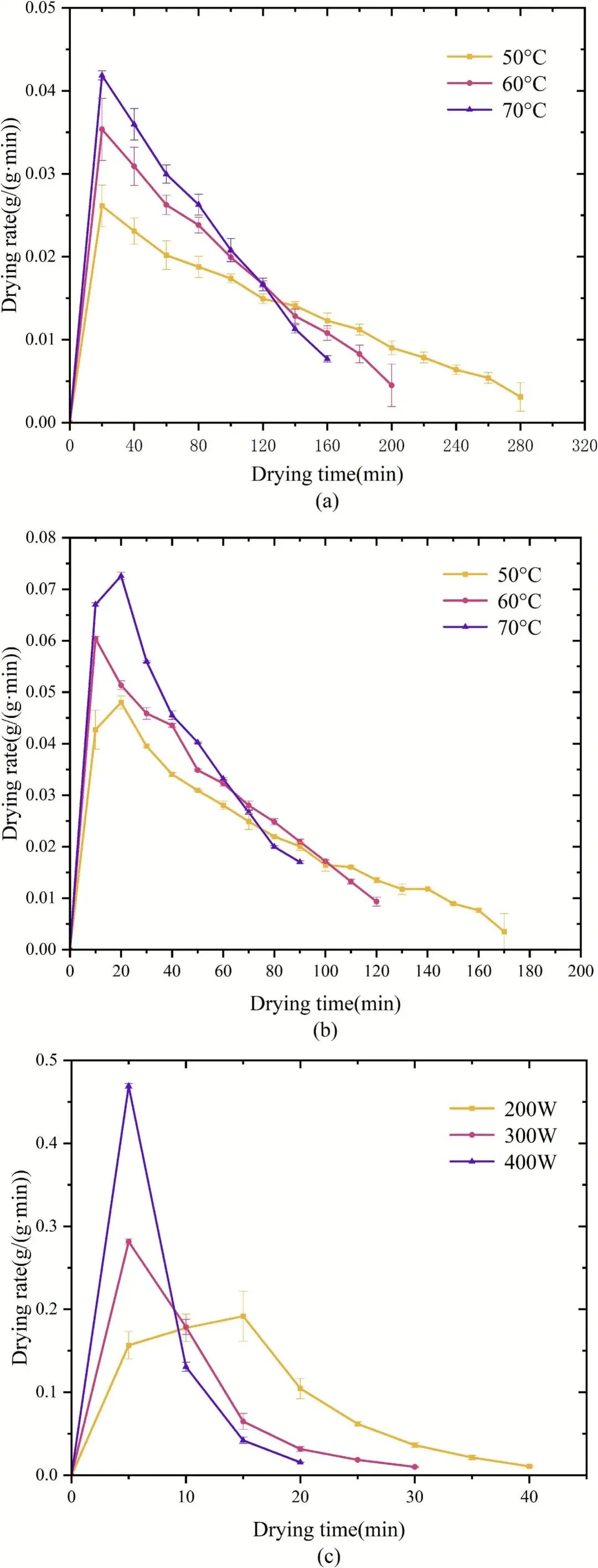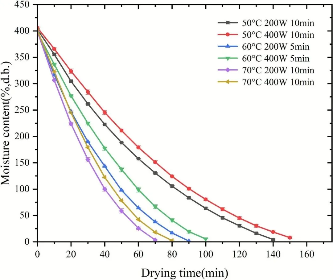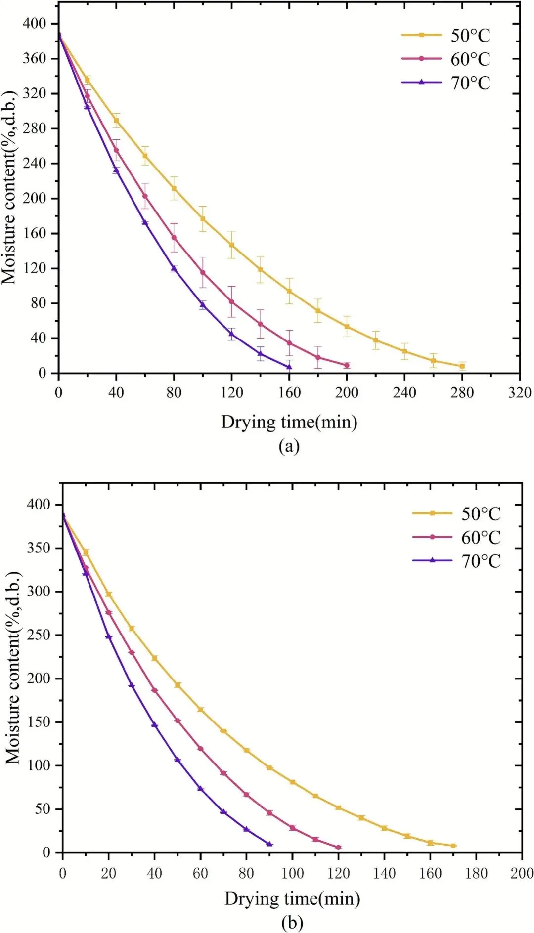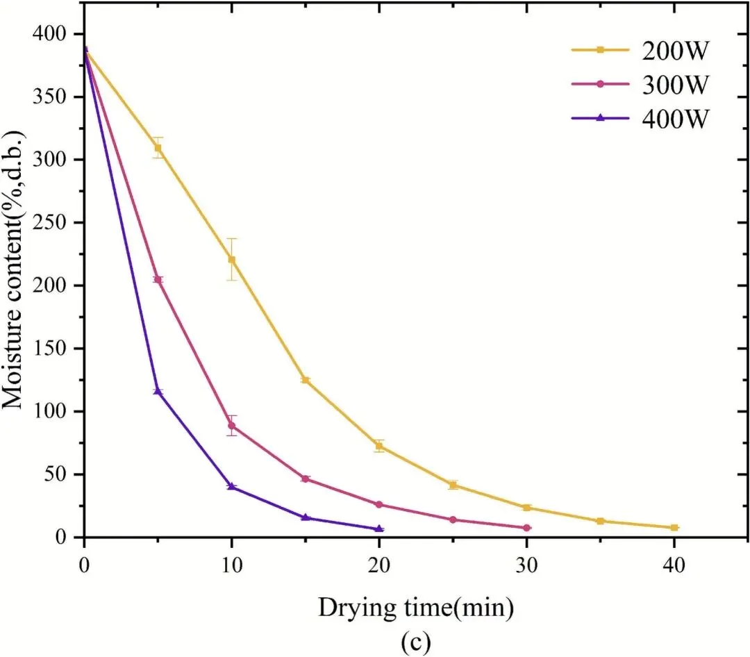 1.干燥效率与能耗: 高温干燥法与自然干燥法中,干燥效率随温度升高而提升;微波干燥法则随微波功率增强而提高。微波干燥法展现出最高干燥效率与最低能耗,这得益于微波诱导的内部加热和分子振动显著提升了有效水分扩散系数。