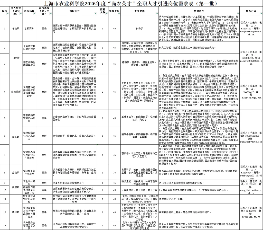 详见《上海市农业科学院2026年度“尚农英才”全职人才引进岗位需求表(第一批)》(附件1)。