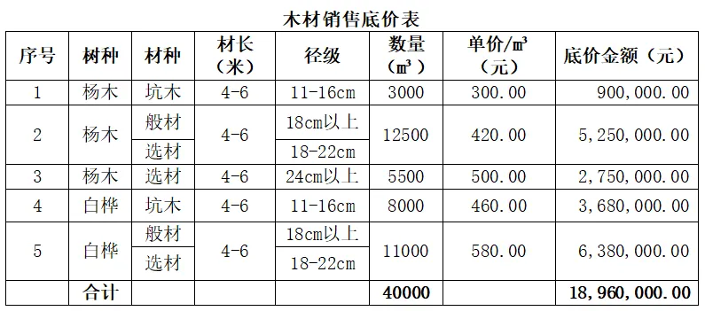 本次竞价销售共设五个标的,木材数量共计40000m³,其中:杨木21000m³,白桦19000m³。木材销售底价表如下: