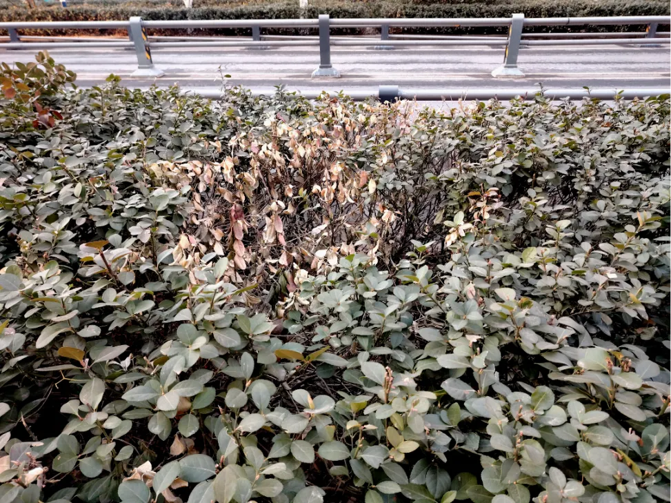 部分绿地大叶黄杨种植过密,导致通风透光不良,病虫害多发等原因导致植株生长势衰弱;加之养护中为追求景观整齐过度修剪,植株生长活力下降、出现退化,叠加冬季冻害影响,加速叶片枯黄脱落,形成‘退化-受害-进一步退化’的恶性循环,危害范围快速扩大。