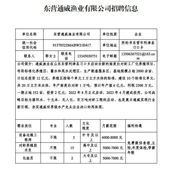 >河口招聘:缴纳五险,免费食宿!东营通威渔业有限公司招聘