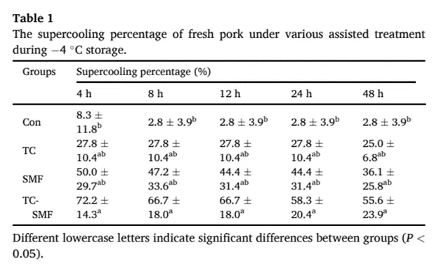 1.静磁场与分阶段降温辅助超冰温贮藏对过冷率的影响