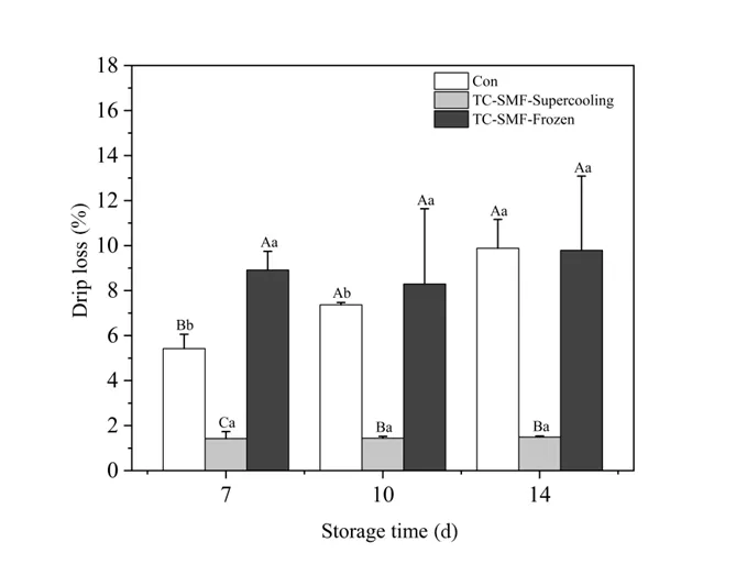 Fig. 2. Effect of TC-SMF treatment on drip loss of fresh pork at -4 °C storage. Different capital letters indicate significant differences between groups (P < 0.05), and different lowercase letters indicate significant differences between the same groups for different storage times (P < 0.05).