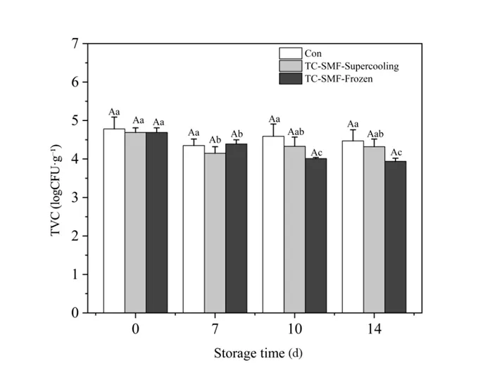 Fig. 3. Effect of TC-SMF treatment on TVC of fresh pork at -4 °C storage. Different capital letters indicate significant differences between groups (P < 0.05), and different lowercase letters indicate significant differences between the same groups for different storage times (P < 0.05).