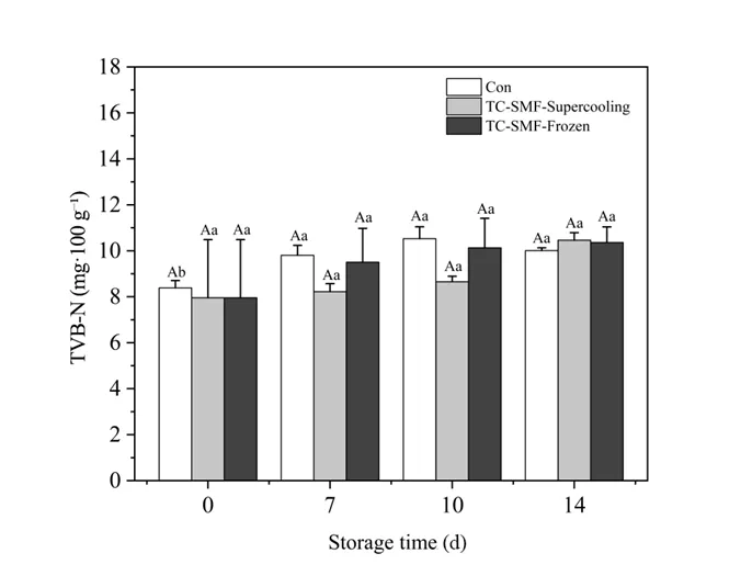 Fig. 4. Effect of TC-SMF treatment on TVB-N of fresh pork at -4 °C storage. Different capital letters indicate significant differences between groups (P < 0.05), and different lowercase letters indicate significant differences between the same groups for different storage times (P < 0.05).
