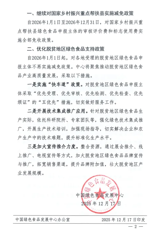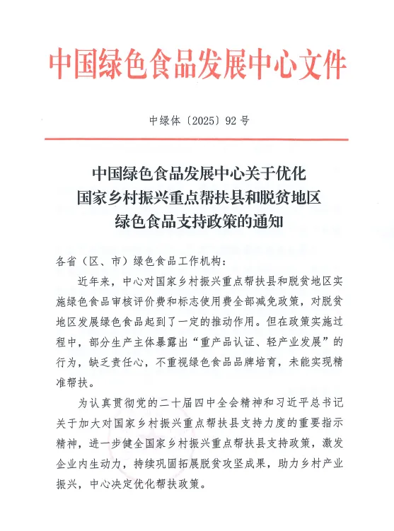 自2026年1月1日起,对各地受理的脱贫地区绿色食品申报主体不再实施减免政策。中心将聚焦推动脱贫地区绿色食品产业高质量发展,采取以下措施。