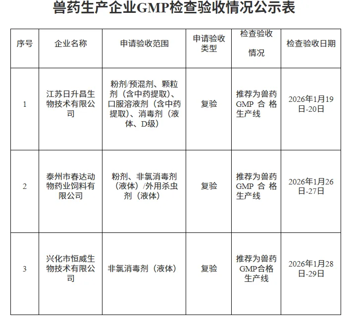 根据《兽药生产质量管理规范》《兽药生产质量管理规范检查验收办法》有关规定,江苏省农业农村厅派出检查组对江苏日升昌生物技术有限公司、泰州市春达动物药业饲料有限公司和兴化市恒威生物技术有限公司三家兽药生产企业实施兽药GMP的情况进行了检查验收。现将检查验收情况予以公示,公示时间为2026年2月3日至9日。公示期内,如有意见和建议,请实名反馈至江苏省农业农村厅兽医局。